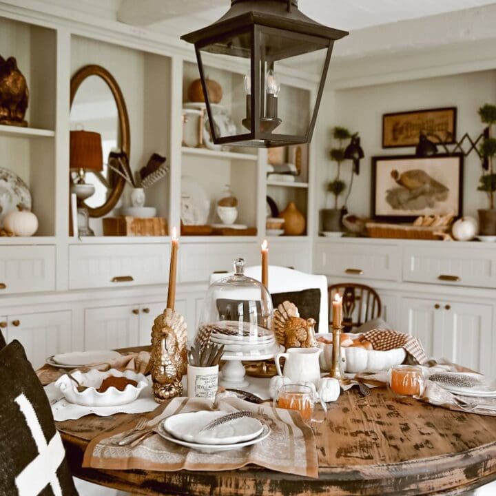 The mix of earthy tones and a touch of vintage with those adorable turkey figurines make this the perfect table for an intimate Thanksgiving dinner.