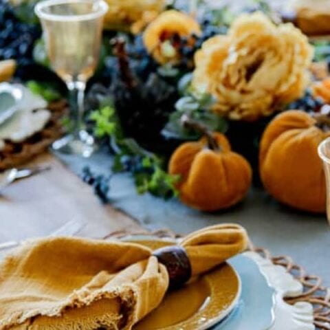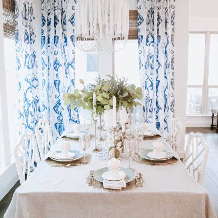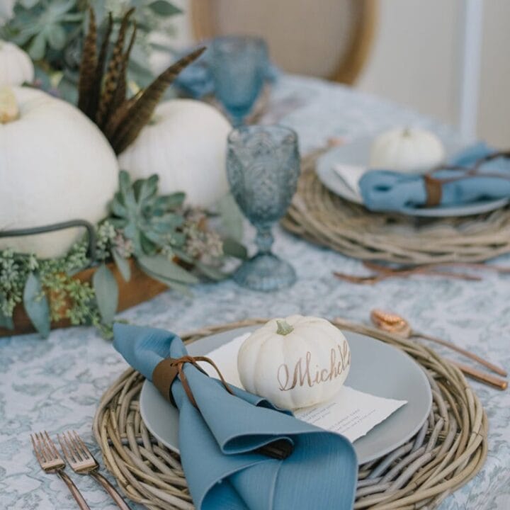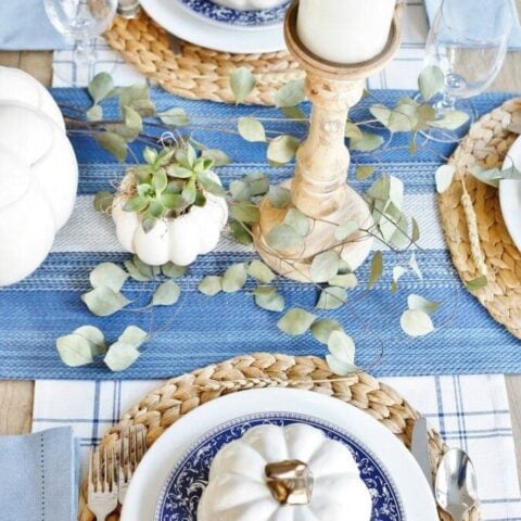 Lovely soft blue accents in the dinnerware and tablecloth tie this Thanksgiving table decor together beautifully.