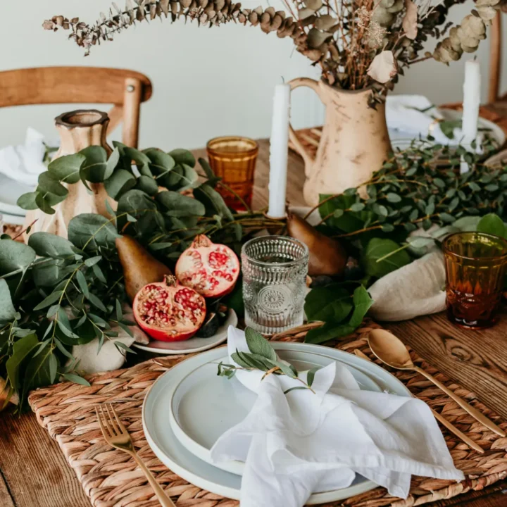 Go for this earthy, natural vibe for your Thanksgiving table setting by placing woven placemats and fresh eucalyptus to make everything feel cozy and welcoming.
