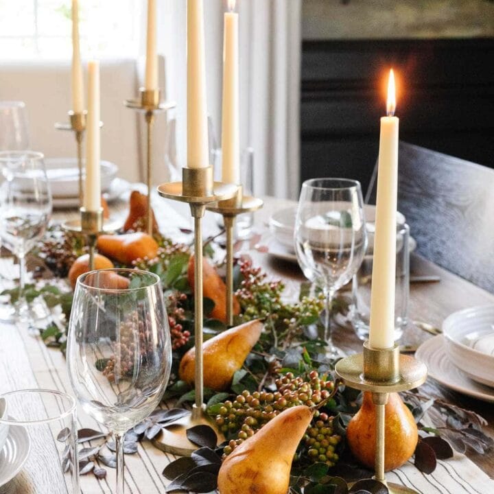 The tall candles and golden pears nestled in greenery add a cozy, elegant feel that’s perfect for making your holiday gathering extra special.