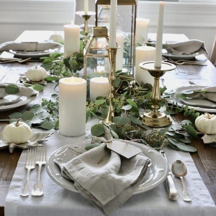 The soft candlelight, fresh greenery, and white pumpkins create a calm and elegant atmosphere that’s perfect for a relaxed and memorable holiday celebration.