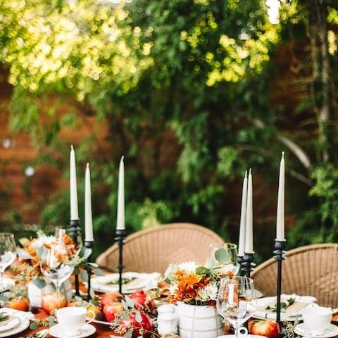 If you want to wow your guests, this outdoor Thanksgiving table setting with warm, rich colors and tall candles is the best setup for an unforgettable celebration.