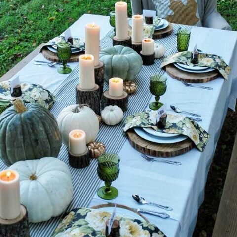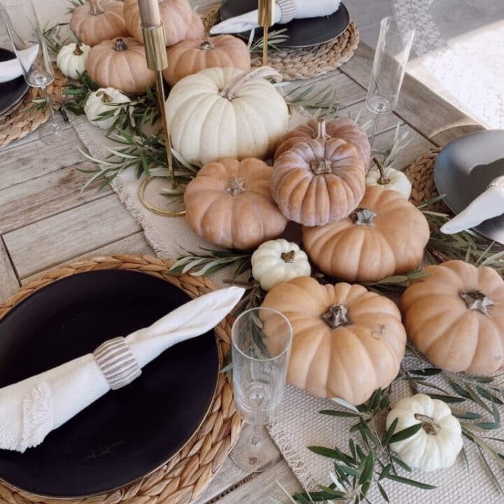 Centerpieces are a must-have for any Thanksgiving table, and I like to keep mine simple yet impactful by using seasonal elements like my DIY pumpkin centerpiece, gourds, and fresh greenery to make it look beautiful and tie in with the season’s theme.