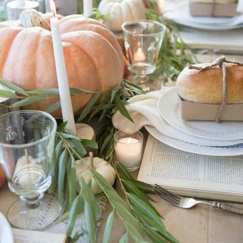 The mix of white and blush pumpkins with a touch of greenery makes your Thanksgiving table setting look effortlessly stylish and totally Instagram-worthy.