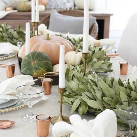 Soft linen tablecloth, bay leaf garland, and lots of beautiful copper accents and silverware truly do set this table.