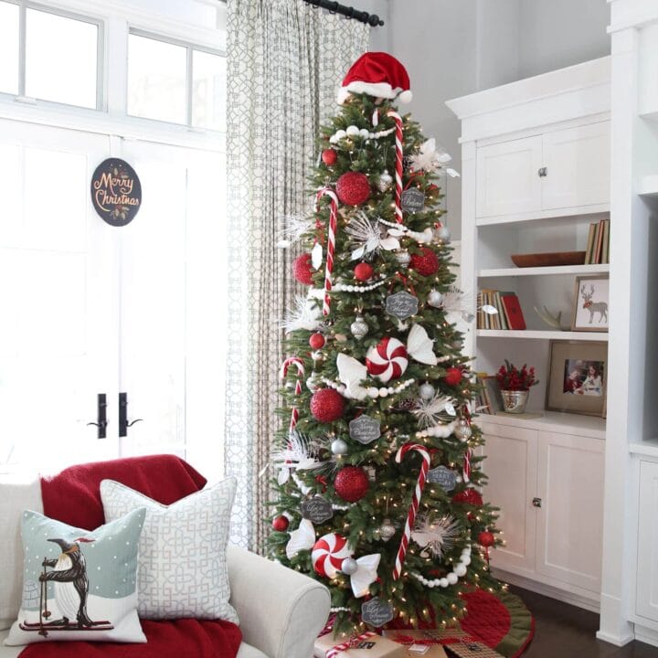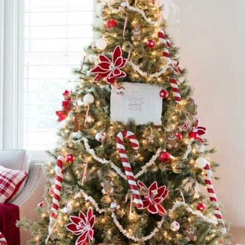 Red and white candies and fun red accents are the perfect touches for this festive Christmas tree.
