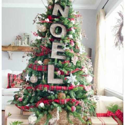 Speaking of country-style ideas for decorating Christmas trees, I am loving the rustic look of the NOEL tree below.