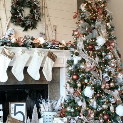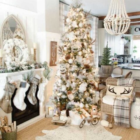Notice the fuzzy white tree skirt that’s echoed in those yummy fur Christmas stockings on the mantel. So cozy and festive!