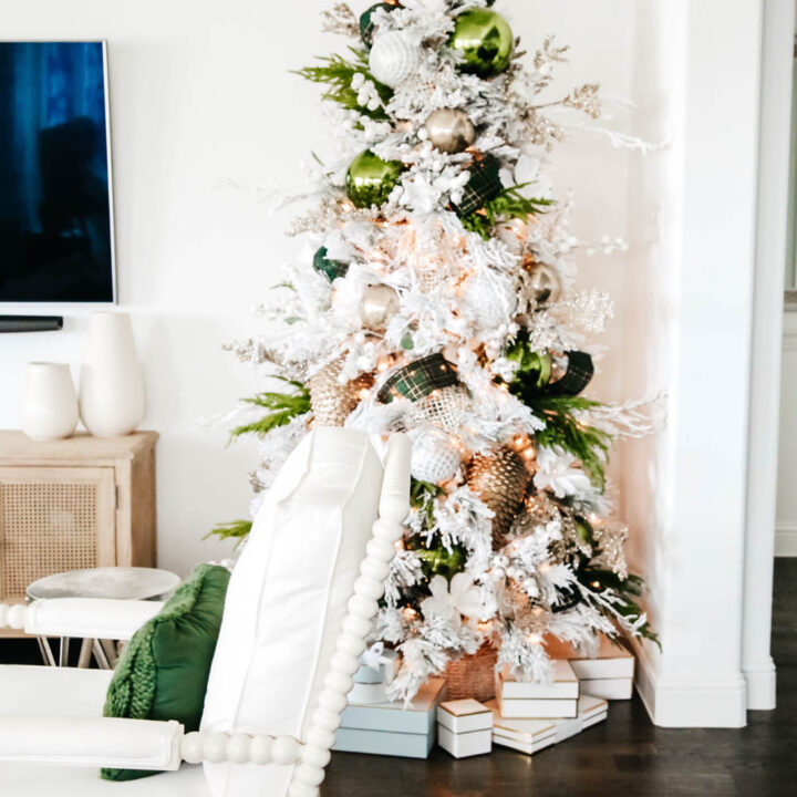 I decided to go with a green and white theme a few years ago for my Christmas tree decorations. The ribbon and big oversized green ornaments pop and really catch your eye!