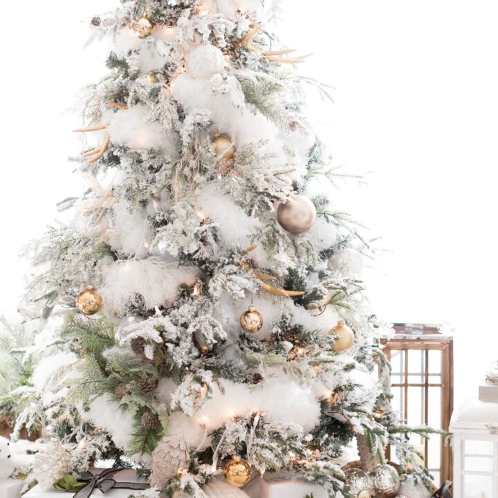 From the gold ornaments to the soft white faux snow tucked into the tree, this is a stunning Christmas tree!