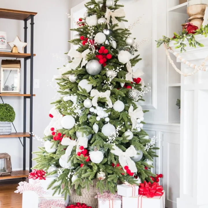 This Christmas tree looks amazing with all the red and candy cane touches, especially the ornaments peeking out amongst the branches.