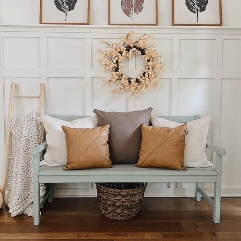 A soft mint green bench is decorated for Fall with some brown hued pillows, a Fall wreath, and some leaf prints.