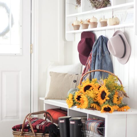 Sunflowers are a sign Fall is here! Fresh cut stems and baskets to corral everything you need for Fall activities are collected on this entryway bench.
