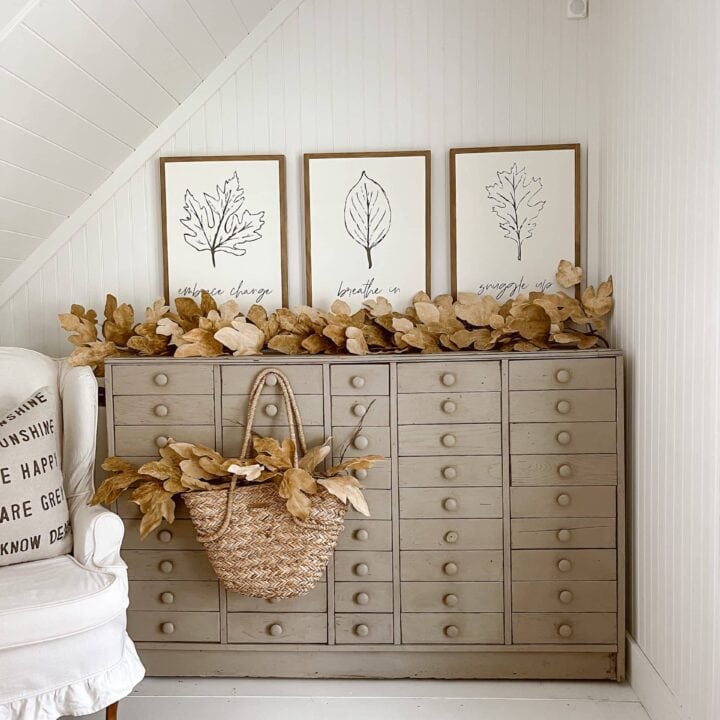 These collected items mixed with a cotton garland and pumpkin decor make this space functional and beautiful.