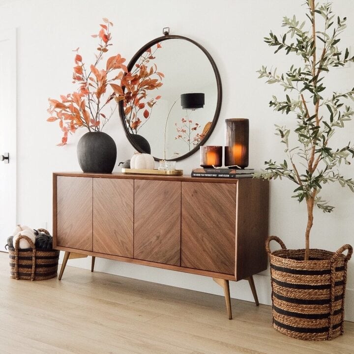 If you love Mid Century Modern decor then this one is for you. Add in amber colored hurricane vases, a black vase and some large fall stems to complete the look for the autumn season.