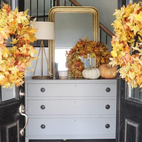 Tie in the Fall wreaths from the front door to the display inside! It pulls your eye in and welcomes your guests.