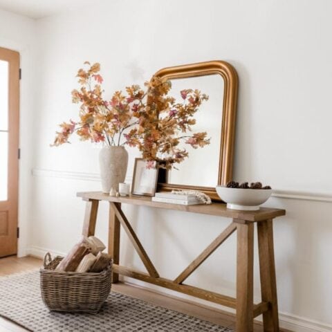 This bright and airy space is accented for Fall with a wood console table, oversized leaf stems, a bowl of pinecones, and a basket of wood.