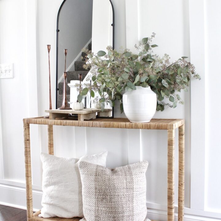 This Fall vignette is full of texture and neutral colors wth cozy pillows and a rattan side table.