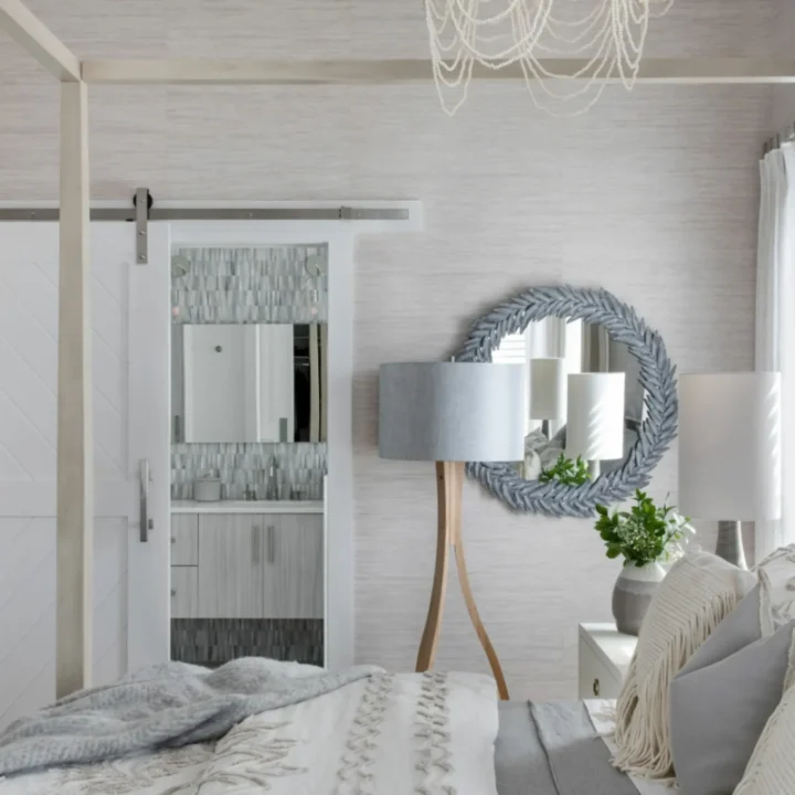This coastal barn door not only elevates the design of the room, but saves space by not having a swinging door.