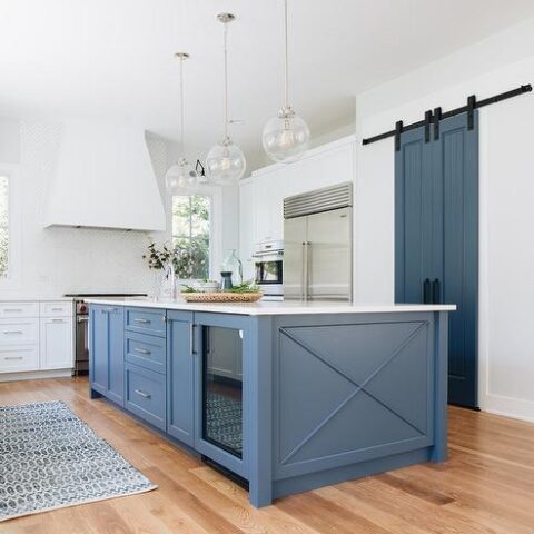 The barn door in this kitchen perfectly matches the kitchen island tying the whole design together.