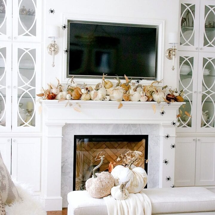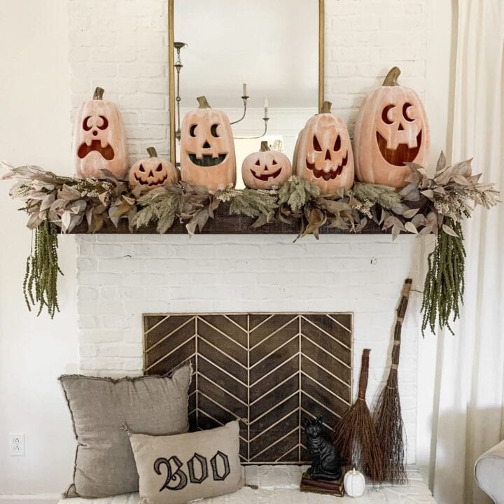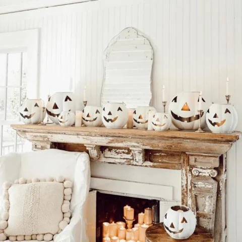 If you're looking for a cozy way to style your home for fall without all the bright colors, try adding a bunch of neutral white jack-o'-lanterns to your mantel for a soft, seasonal vibe that feels super welcoming.