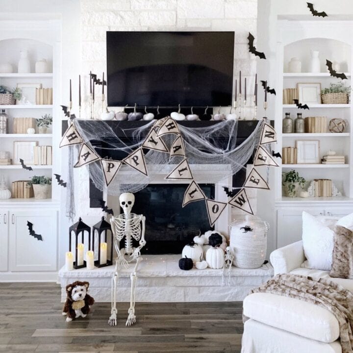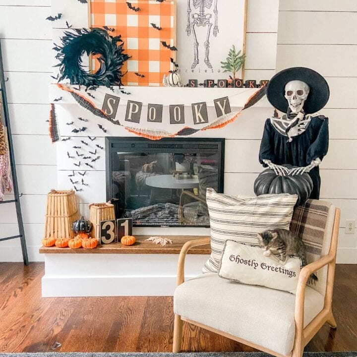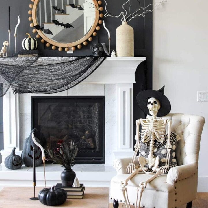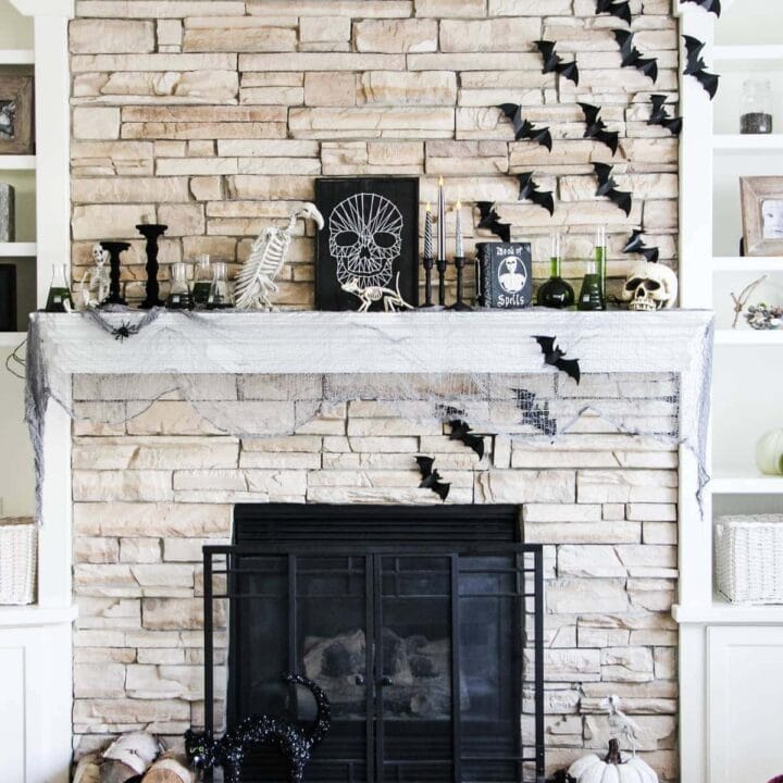Bring some Halloween vibes into your home with this DIY Halloween mantel setup with a fun mix of spooky bats, creepy skeletons, and eerie accents for a perfectly haunted look.