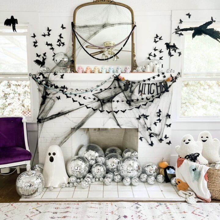 For a fun and quirky Halloween vibe, try filling your fireplace with some shiny disco balls in and add a few playful ghosts and bats to your mantel for a cool mix of spooky and sparkle.
