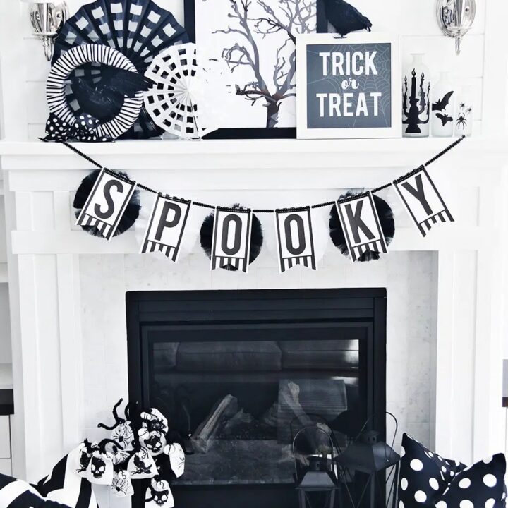 If you're into a classic black-and-white Halloween vibe, try mixing some easy DIY projects like banners and spooky candles on your mantel for a look that’s super stylish and simple to pull off.