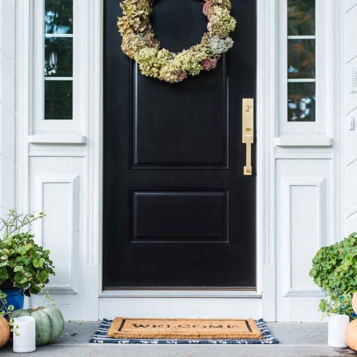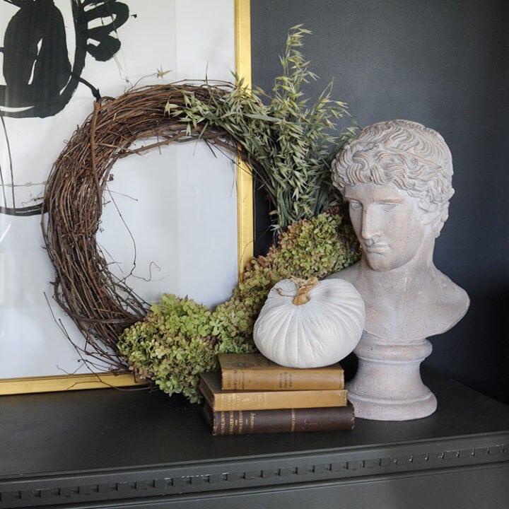 Using dried hydrangeas or faux ones and a simple grapevine wreath creates a simple project that can transform your front door for the fall season.
