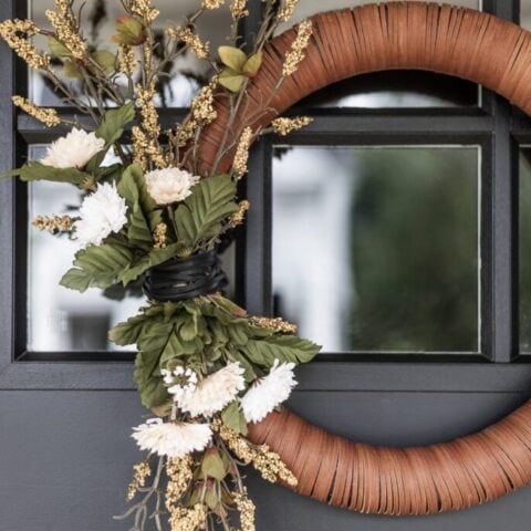 With seasonal flowers tucked into the side it is the perfect fall farmhouse wreath.
