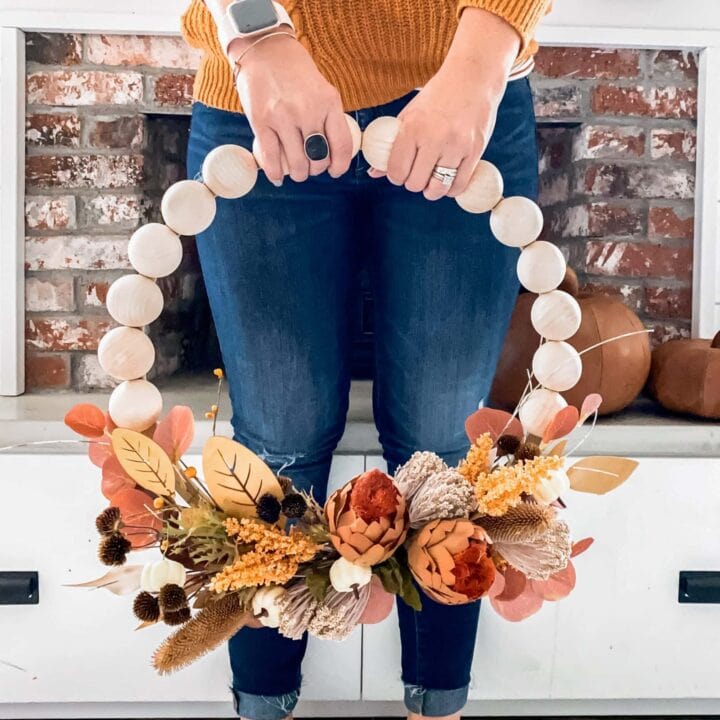 A wood bead wreath for fall is the perfect way to welcome the change of the season with open arms.