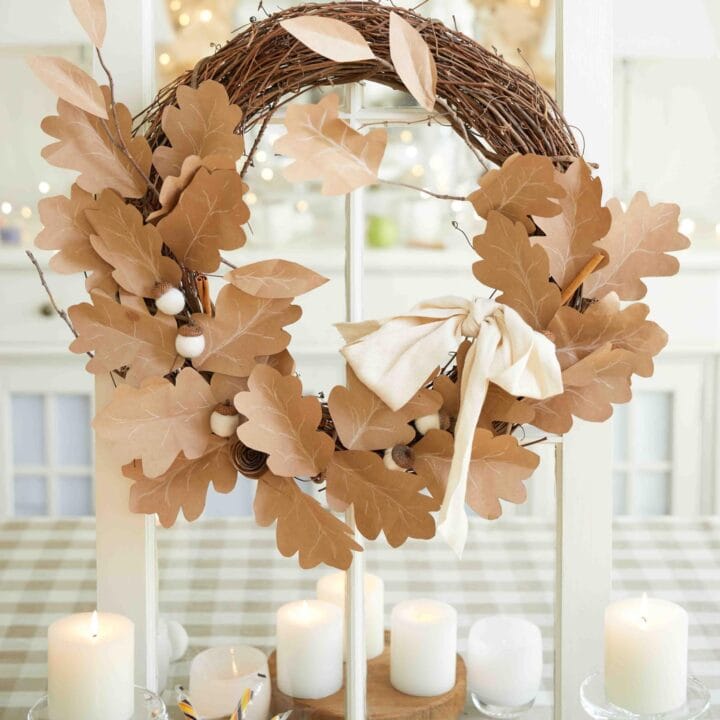 Use those paper bags from the grocery store and create a beautiful fall wreaths with paper leaves.