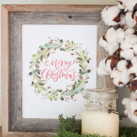 Bring some farmhouse charm to your space with this lovely printable featuring a watercolor wreath and a classic holiday greeting.