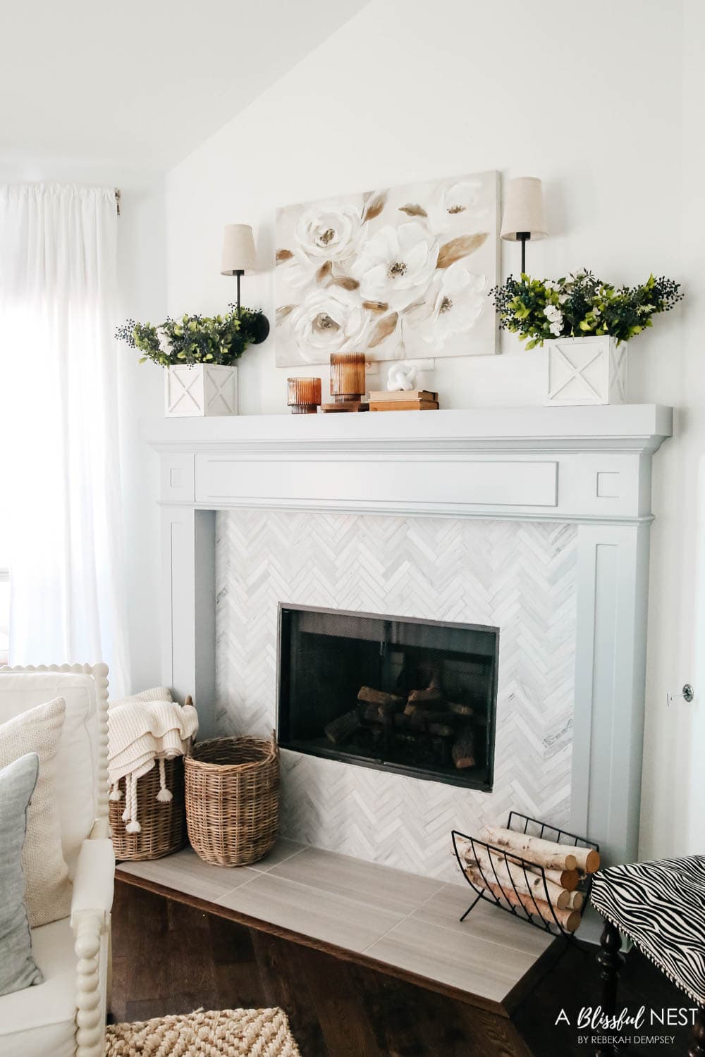Seasonal fireplace decor works beautifully when you choose neutral base arrangements that you can easily update with small seasonal touches throughout the year.