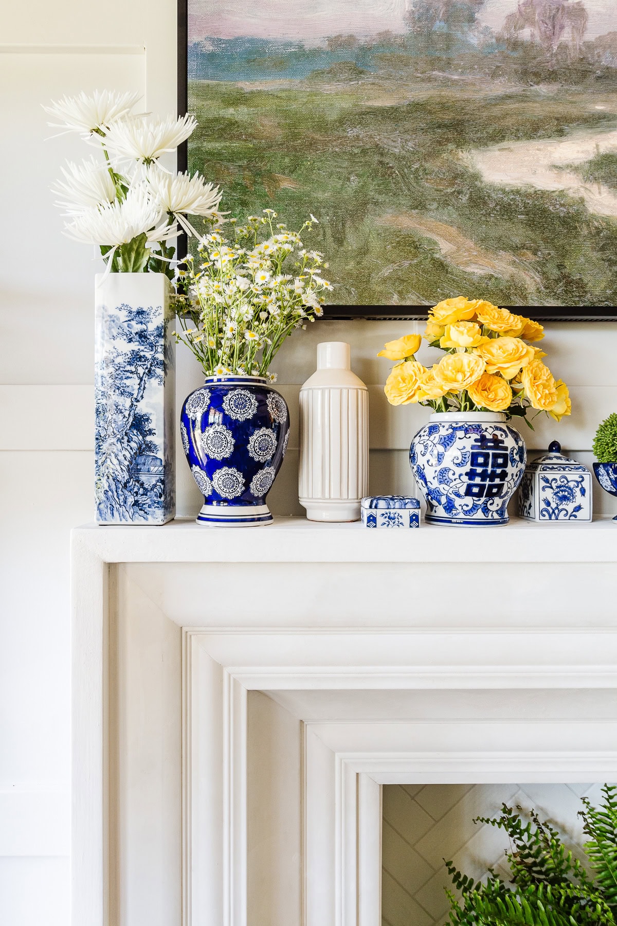 Keep your favorite vases and containers consistent throughout the year so your seasonal fireplace decor always feels cohesive, even as the flowers inside them change.