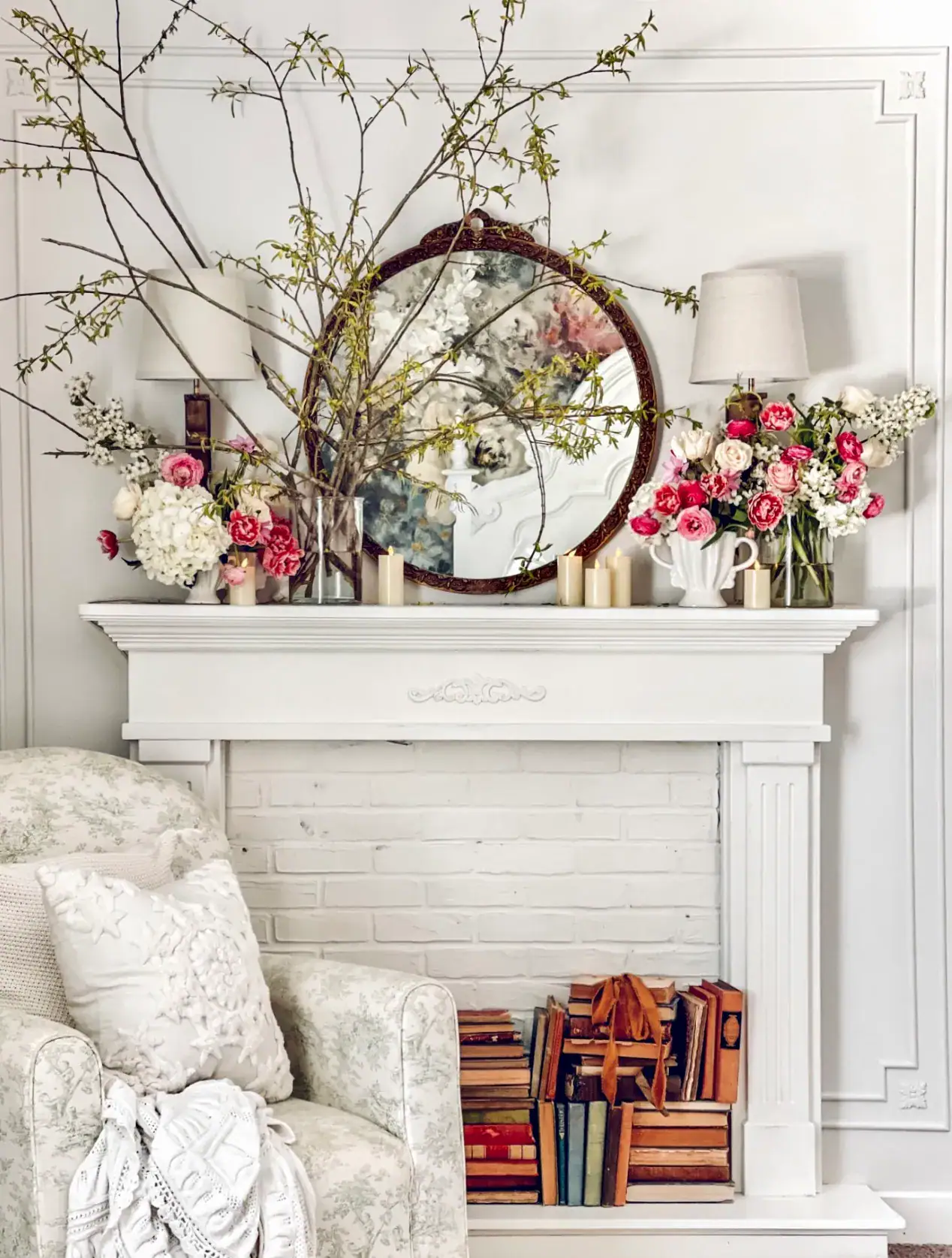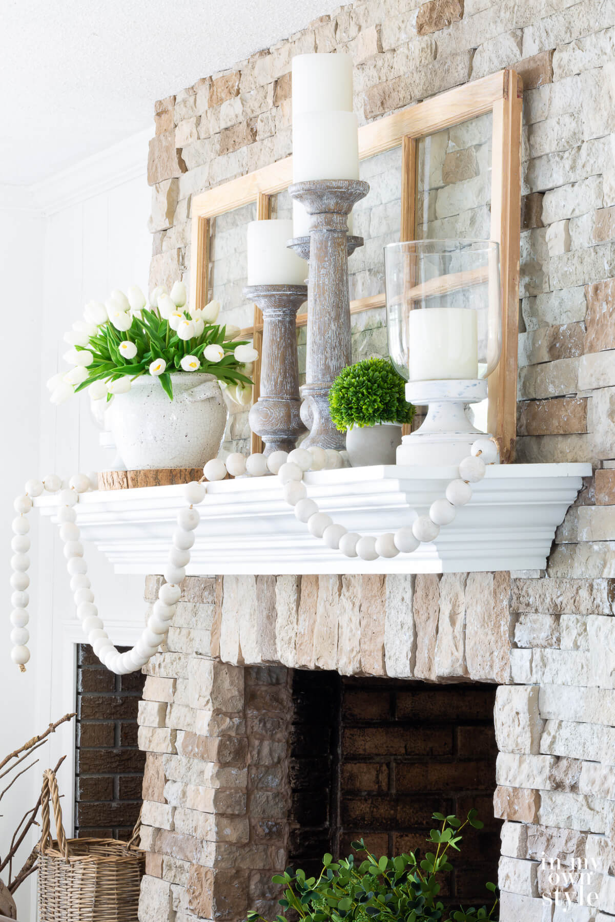 For spring, consider adding pastel colored flowers like tulips, daffodils, or cherry blossoms that bring a light and airy feeling to your mantel display.