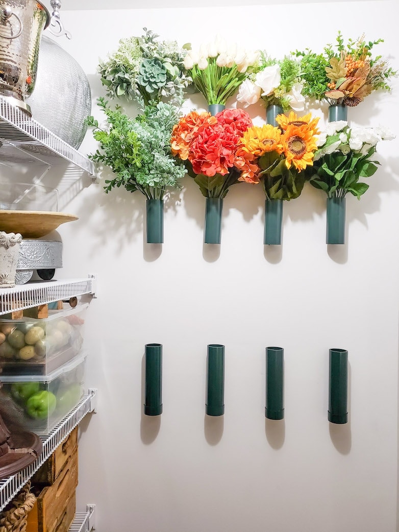 Pantry shelves or utility room storage work great for smaller faux flower arrangements and supplies, especially when you organize everything neatly in labeled boxes for super easy access anytime.