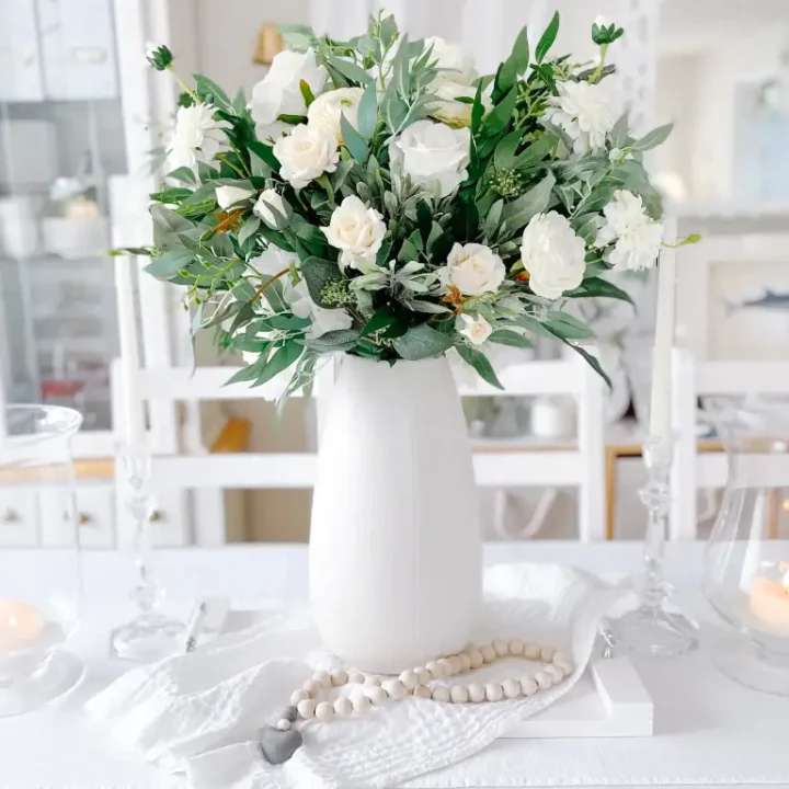 This all-white arrangement feels soft and peaceful, perfect for a bright dining room or kitchen with a calm focal point.