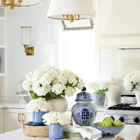 Hydrangeas and white roses pair beautifully with chinoiserie jars and soft blue accents, giving this space a crisp, polished, high-end look.