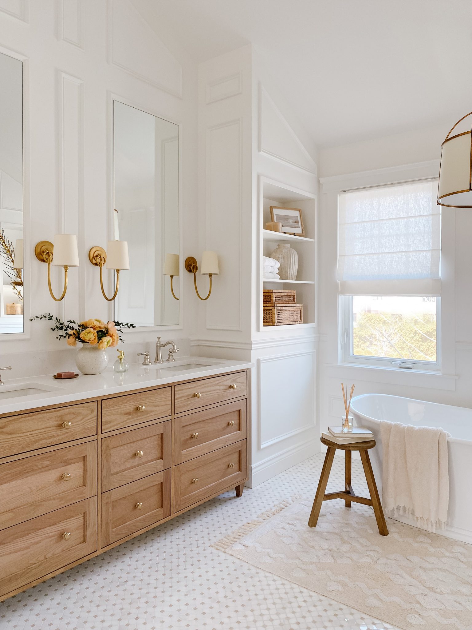 Wall sconces on each side of the mirror help balance light and make your space feel welcoming, especially in the early morning or evening.
