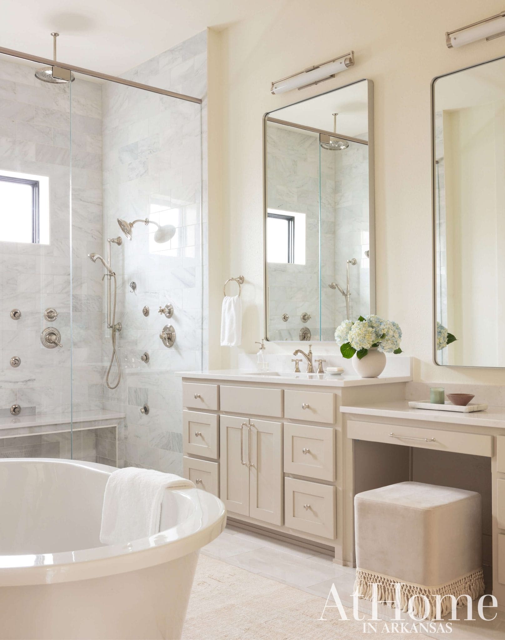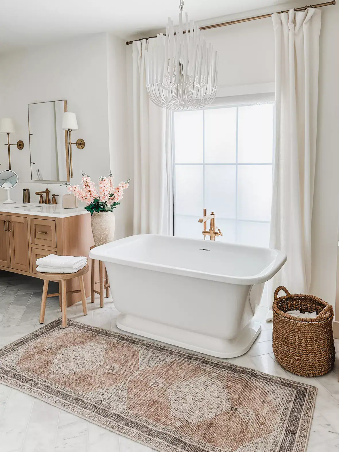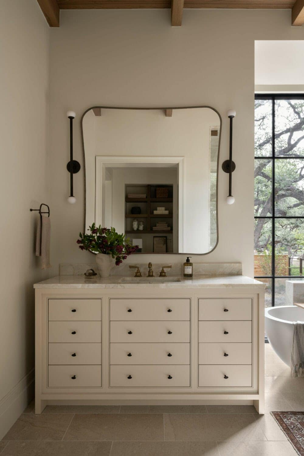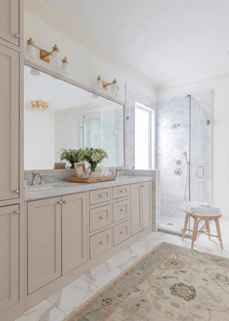 Don’t forget the power of texture. Layer in soft towels, wooden shelves, or mixed metals to break up all the beige in the room.