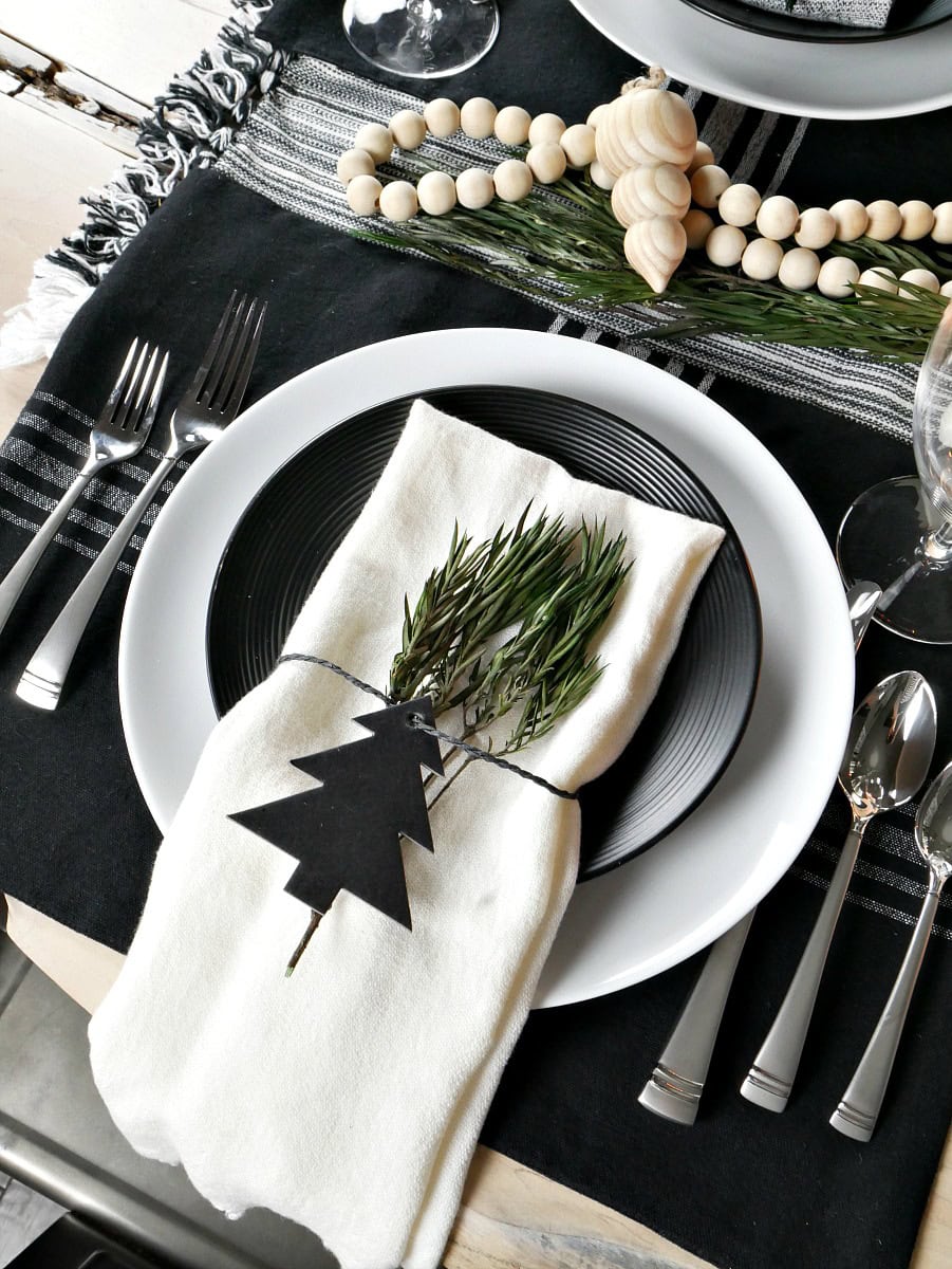 Chic modern Christmas table settings ideas often come from mixing textures like linen, wood, or ceramic, which look even better in a black and white setup.