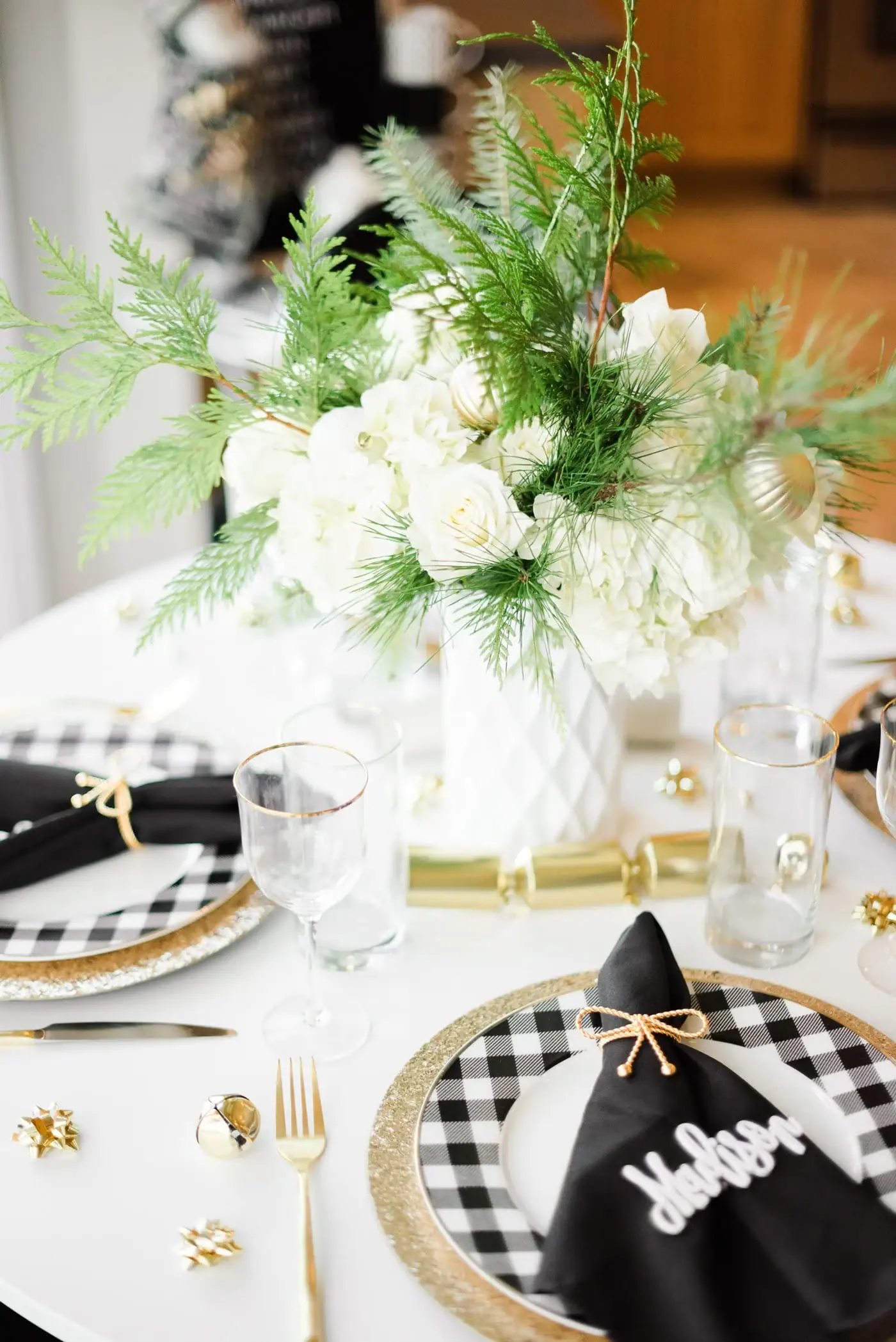 Finish things off with greenery or simple centerpieces that bring life to the table without overpowering the black and white theme.