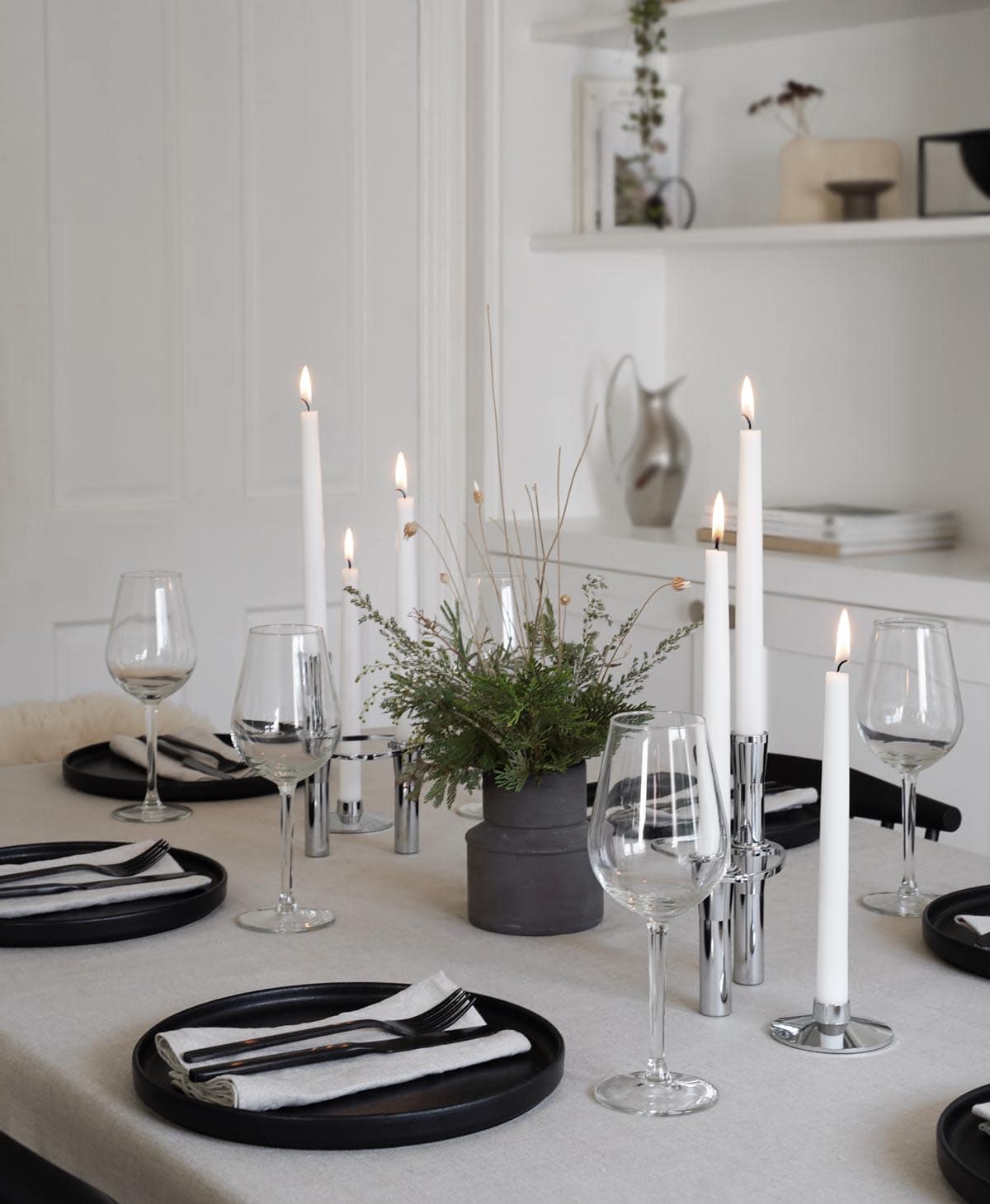 Candles in black or white holders add a warm glow to the table and help bring everything together in a soft and relaxing way.