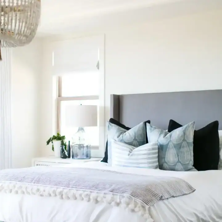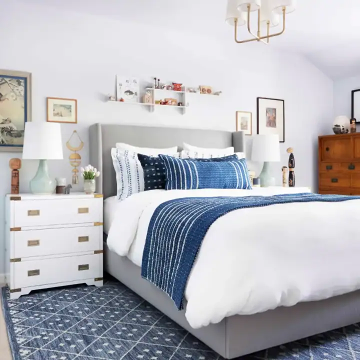 You can also keep the walls white and bring in blue through pillows, rugs, or art for an easy update that works well with layered bed ideas.