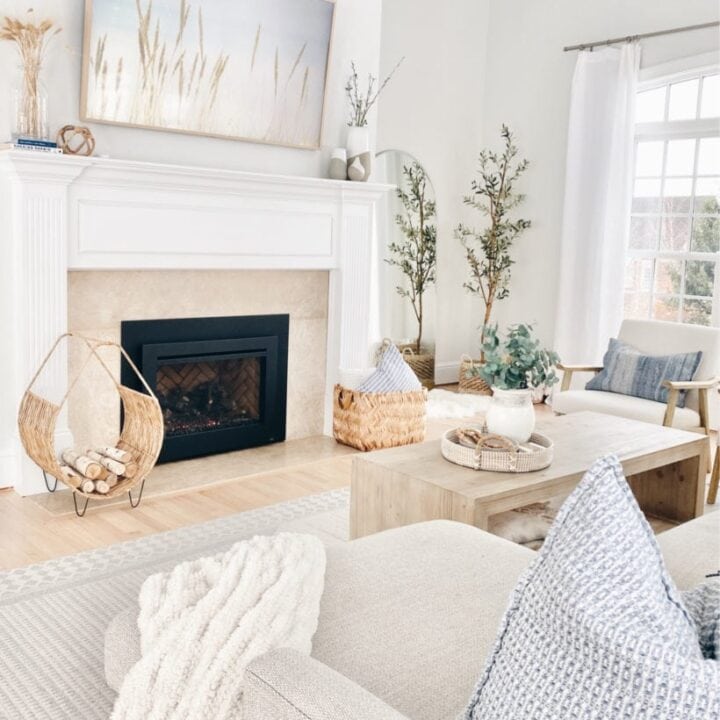 With neutral tones, woven accents, and soft textures, this fireplace design feels warm, welcoming, and perfect for a peaceful coastal-inspired home.