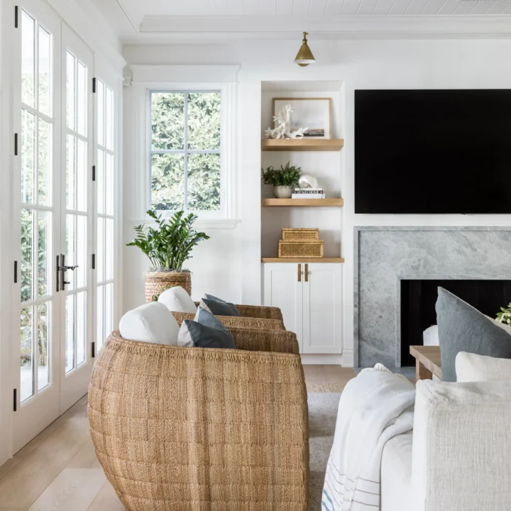 This stunning coastal living room uses woven chairs, crisp white seating, and soft blues to create a naturally stylish and relaxing atmosphere.