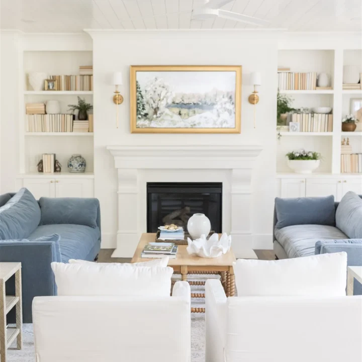 This elegant yet cozy living room balances classic and coastal design with built-in bookshelves, a white fireplace, and comfortable blue seating everywhere.