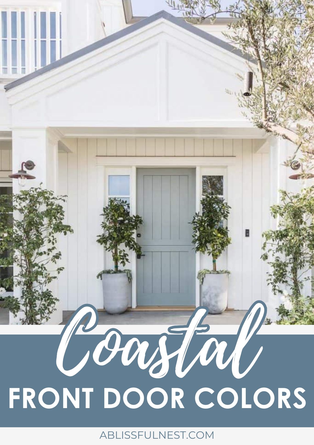 Imagine adding simple planters beside the doorway because those pieces bring natural greenery that pairs well with coastal front door colors.