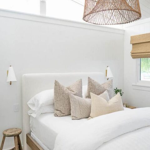The woven light fixture and natural textures in this bedroom make it feel so grounded and coastal.
